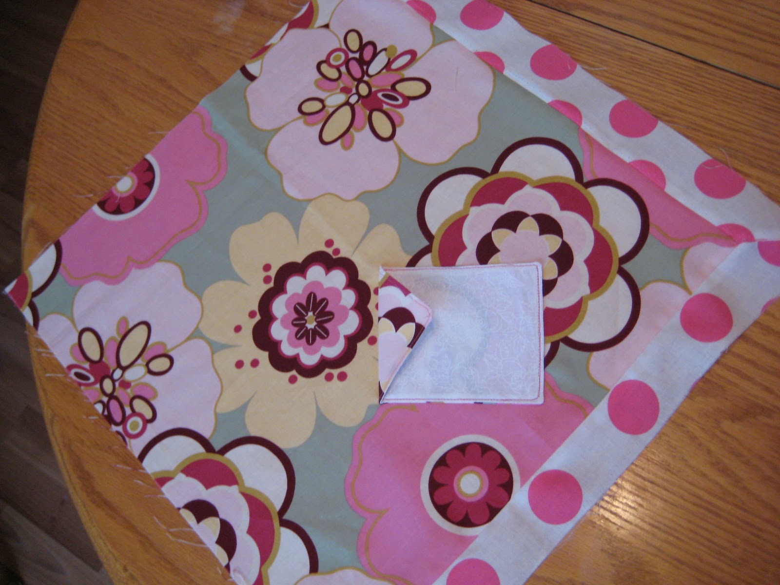 Next we'll work on the pocket.  Now ideally you'd want one side to be the flowered fabric and the other the polka dot but I used a fat quarter and just didn't have enough for the pocket.   The white made a nice stand in though.  I also think the neck strap would have been cute polka dot but I had to make do with what I had.