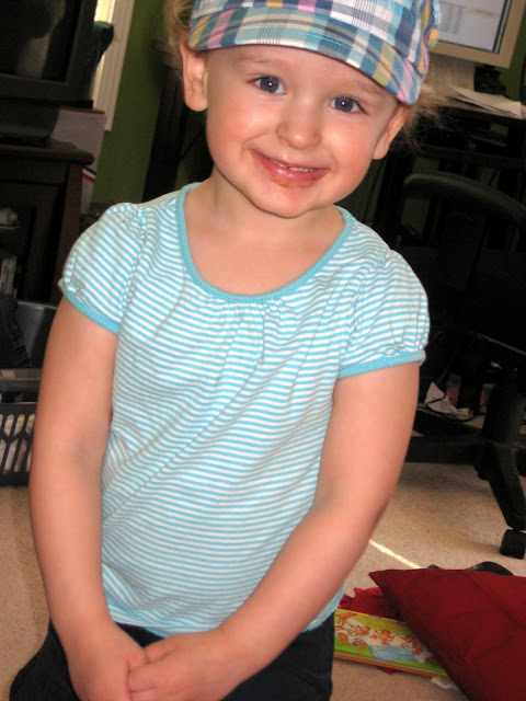 I found this "dress" in a pile I'd forgotten about so I put it on her, check out those sleeves. She definitely won't wear it again especially because it was so short. I tried to convince her to wear something else but she insisted in staying int his all day. I enjoyed the two hats she's wearing and the headband though.