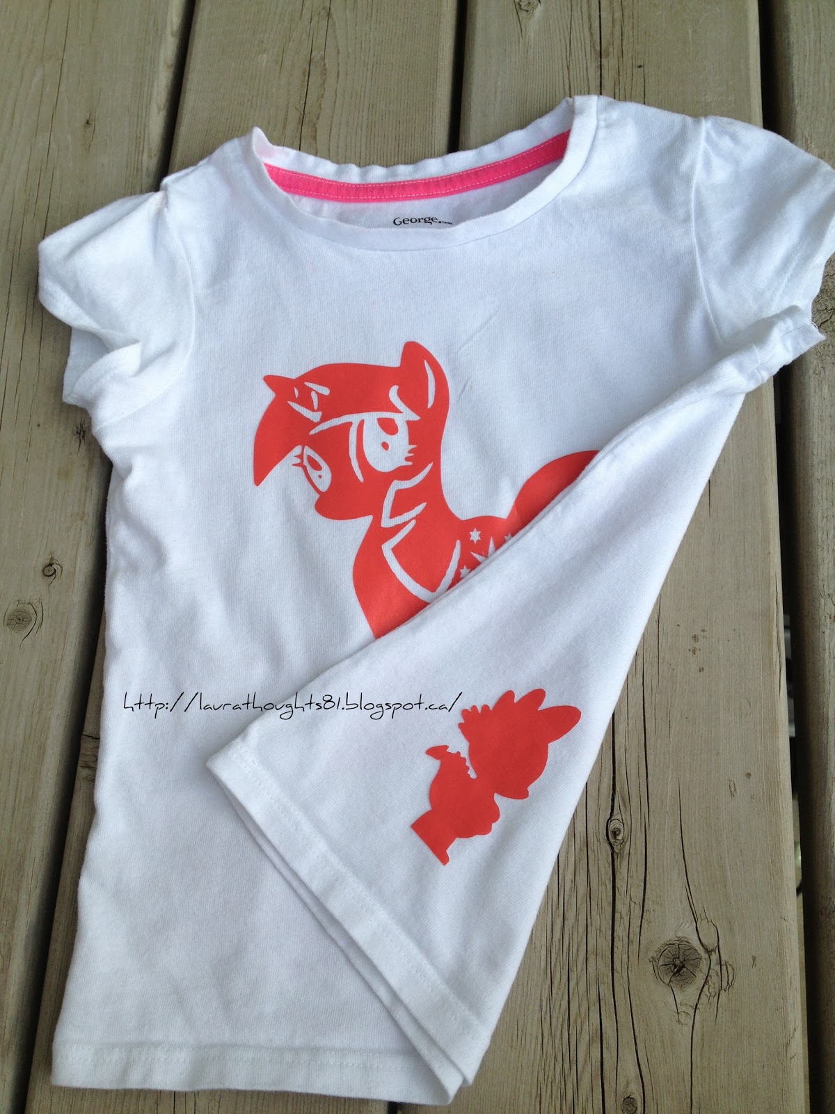 I let Catie choose who should be on her cousin's shirts so for Gwen she picked Rainbow Dash. I loved the one I did above with all the different poses but that was a larger shirt, I knew they'd be way too tiny if I tried to use all 6 of them so instead I just chose my favourite four. Then I added a basic silhouette of her to the back of the shirt.